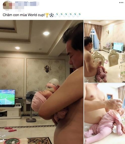 Loạt ảnh ông bố "bụng phệ" tay bế con gái cho bú, mắt đảo xem World Cup gây thích thú "